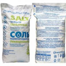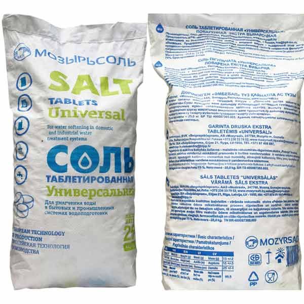 Соль таблетированная "МОЗЫРЬ" (Беларусь) 25кг. применяется для восстановления ионообменных смол катионовых фильтров в системах умягчения и подготовки воды для технологических, технических и бытовых нужд.
