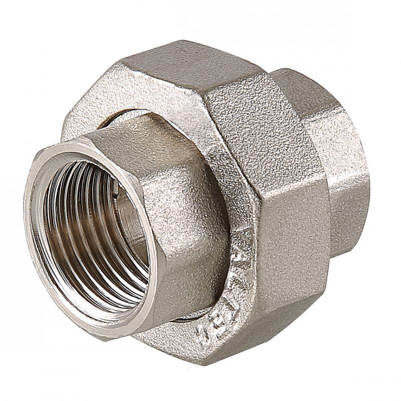 Латунная никелированная разъемная муфта. Резьба – внутренняя/внутренняя, цилиндрическая трубная по ГОСТу 6357 (ISO 228, EN 10226), совместима также с наружной конической трубной резьбой по ГОСТу 6211 (ISO R7). Соединение частей муфты осуществляется с помощью накидной гайки. Уплотнительное кольцо выполнено из синтетического каучука EPDM. Гайку следует накручивать с приложением момента не более 30 H•м.