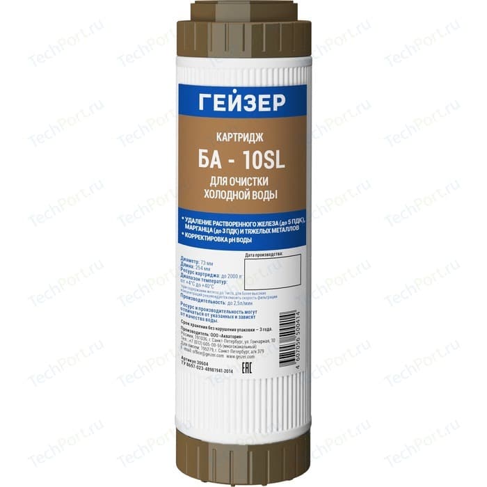 Картридж БА - 10SL используется для эффективного удаления избыточного растворенного железа (до 1 мг/л) и соединений других металлов методом каталитического окисления. Фильтрующая загрузка – природный материал Кальцит.