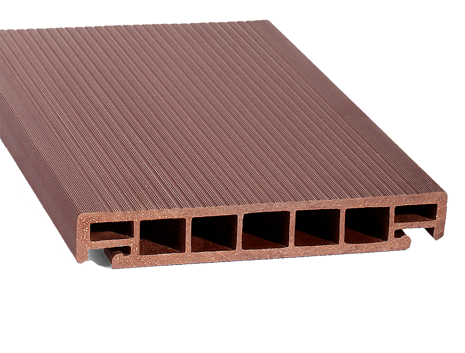 Террасная доска из ДПК на основе ПВХ c закрытыми боковыми торцами и нескользкой ребристой поверхностью.