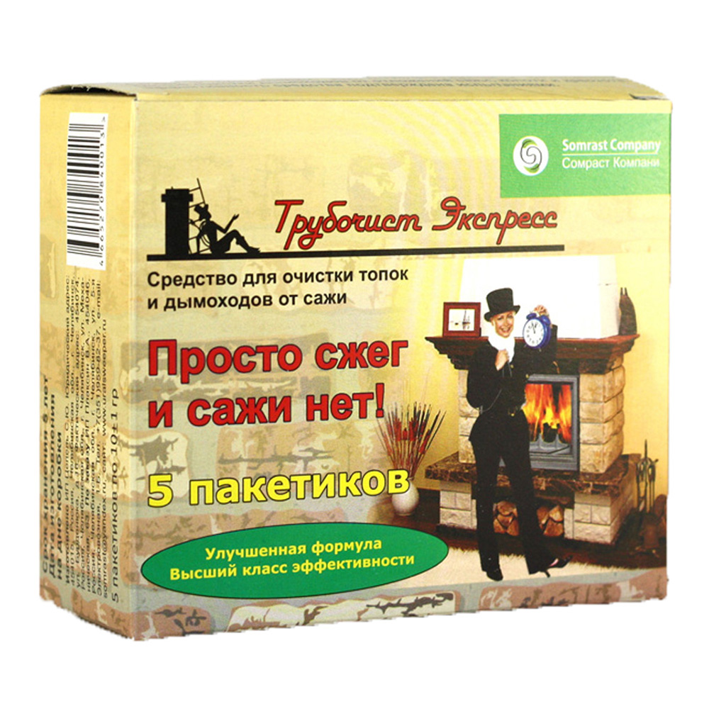 Трубочист, это прекрасное решение для чистки дымохода от сажи и копоти. Оно очень просто в применении, достаточно сжечь в топке пару пакетов и ваш дымоход чист. Если загрязнение дымохода очень сильное, то желаемый эффект от средства может быть достигнут не с первого применения. Для повторной процедуры очистки необходимо сначала остудить дымоход и повторить ее не ранее чем через 6 часов. Во влажную погоду эффект от средства будет усиленным, т.к. в дымоходе будет присутствовать лишняя влага, благодаря которой образуется раствор, который растворит сажу быстрее.