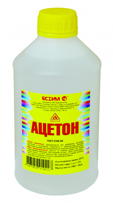 Высококачественный ацетон Ясхим. Для растворения лаков, красок, эмалей, природных смол, масел, полистирола, эпоксидных смол, полиакрилатов хлоркаучуков. ГОСТ 2768-84.