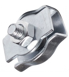 Зажим для троса одинарный плоский (Simplex, две пластины соединенные между собой одним винтом с гайкой) применяется при сращивании стальных тросов и другого стоячего такелажа, создания петель на концах и т.п. Для надежного закрепления тросов необходимо использовать не менее трех одинарных зажимов на одно соединение.