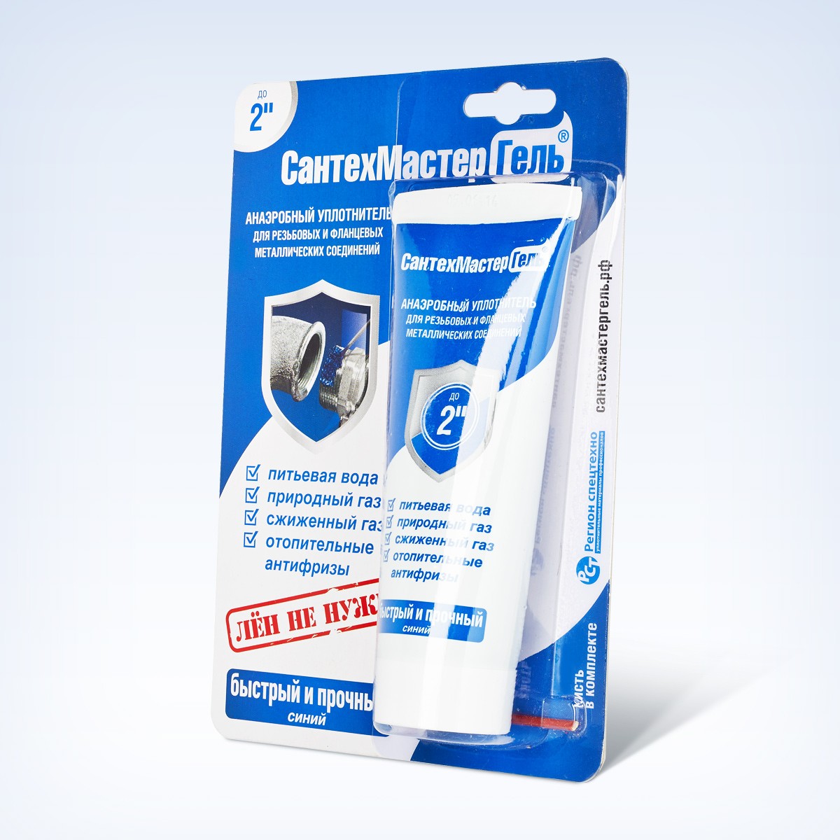 СантехМастер Гель Синий – анаэробный герметик для металлических резьбовых и фланцевых соединений. Образует высокопрочное уплотнение, устойчивое к различным средам: вода, природный и сжиженный газ, бензин, отопительные антифризы и др. СантехМастерГель — уплотнительный материал последнего поколения. Ранее такие материалы применялись только в сфере обороны, космоса и высокотехнологичного машиностроения, но в настоящее время получили широкое распространение благодаря продвижению на открытом рынке.
