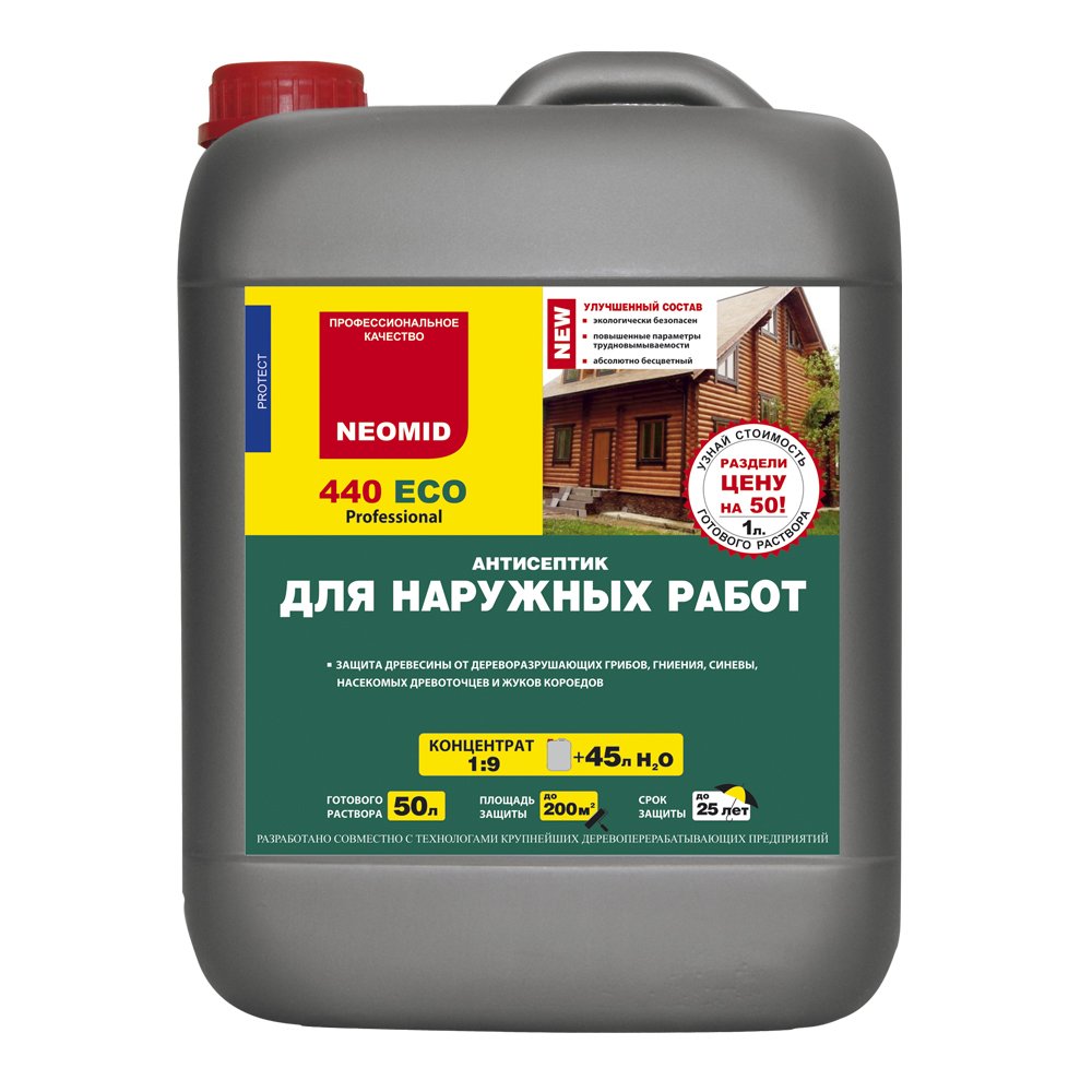 NEOMID 440 ECO — бесцветный антисептик для защиты древесины внутри и снаружи помещений, в том числе для работ в помещениях с высокой влажностью. Защищает древесину различных пород от гниения, поражения дереворазрушающими и деревоокрашивающими плесневыми грибами, насекомыми-древоточцами, водорослями, мхами, лишайниками на срок до 25 лет.