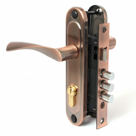 Замок врезного типа устанавливается в межкомнатные или входные двери, комплектуется 5 английскими ключами и выполнен в цвете "медь".