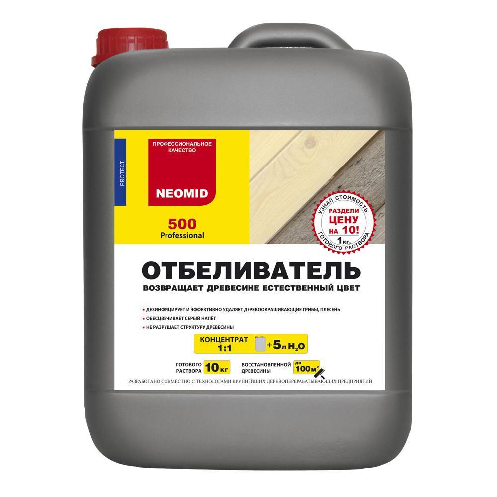 NEOMID 500 — отбеливающий и очищающий состав. Эффективно уничтожает деревоокрашивающие и дереворазрушающие грибы, удаляет серый налет, возвращает древесине естественный цвет, повышает ее сортность. Может быть использован для обработки паллет для хранения и транспортировки пищевых продуктов. Не изменяет структуру древесины, ее естественных свойств.