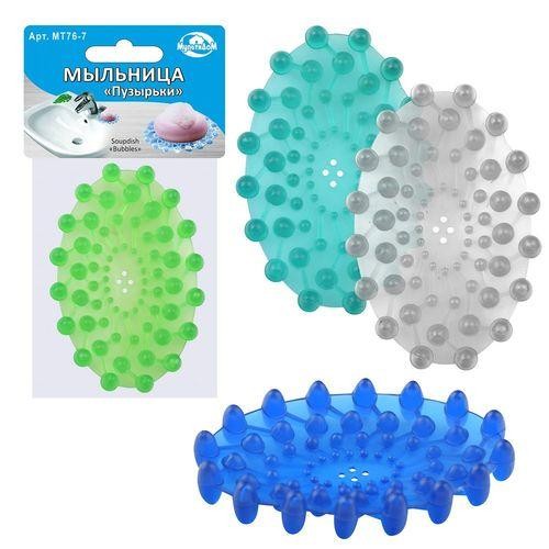 Мыльница «Пузырьки» - это не только практичность, но и привлекательный дизайн. Изделие представлено в четырех цветовых исполнениях: прозрачном, голубом, зеленом и салатовом. Мыльница имеет привлекательный дизайн, который подходит для большинства интерьеров современных ванных комнат.