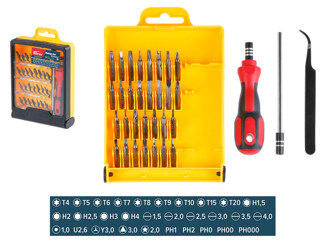 Набор состоит из 30 бит, магнитного держателя, удлинителя держателя и пинцета.
