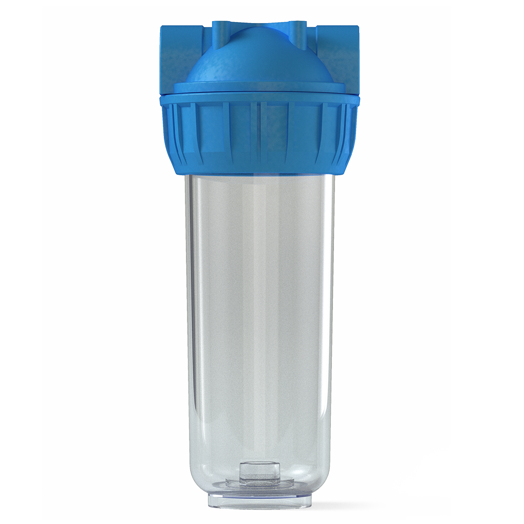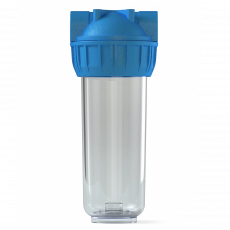 изготовлен из прозрачного пластика, крышка корпуса выполнена из полипропилена с латунными резьбовыми вставками. Корпус рассчитан на работу под давлением и установку на входе в систему холодного водоснабжения. Все части корпуса фильтра изготовлены из материалов, допущенных к контакту с питьевой водой.