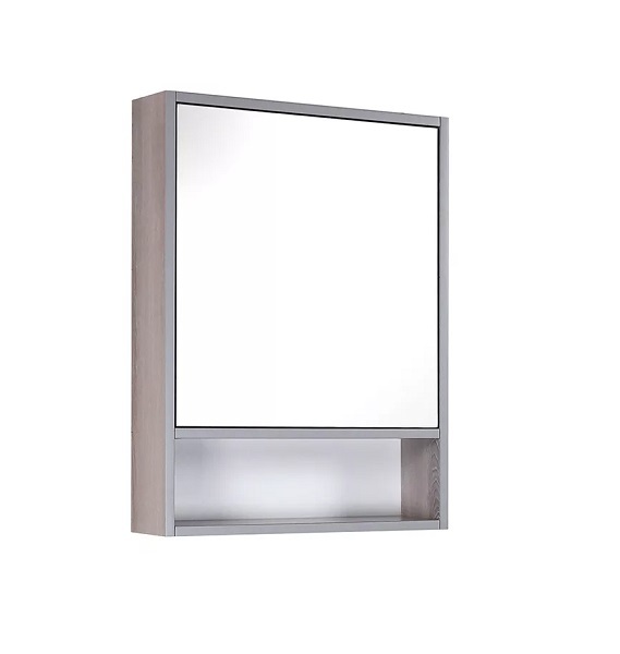 Шкаф-зеркало для ванной комнаты Oника из серии Натали шириной 50 см. Наполнение - однодверный ящик с полками, внизу - открытая ниша. Фасад - фрезерованный, шлифованный МДФ с покрытием пленкой ПВХ.