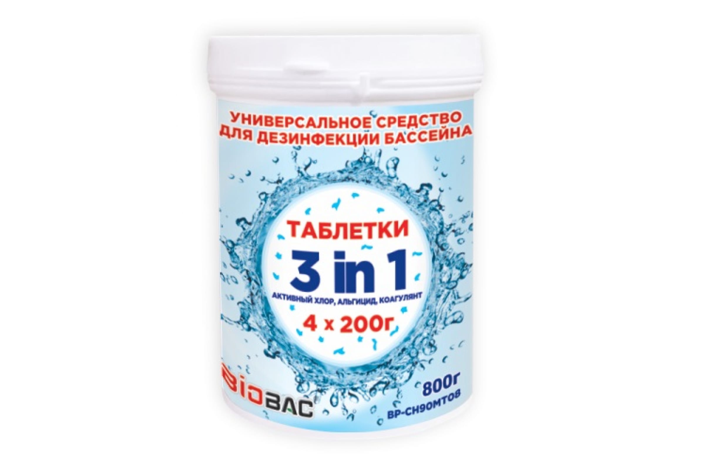 Универсал 3 в 1 хлор, альгицид, коагулянт БиоБак таблетки 200 гр. BP-MT800 используется для дезинфекции воды.