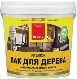 Лак «Неомид Interior» предназначен для эффективной защиты и финишной декоративной отделки поверхности древесины внутри помещений и под навесом. Быстросохнущий, водорастворимый. Практически не имеет запаха. Сохраняет и подчёркивает естественную структуру древесины. Образует защитное полуматовое прозрачное покрытие с высокой эластичностью. Благодаря входящим в состав лака биозащитным добавкам предотвращает образование плесени. Не использовать для лакирования деревянного и паркетного пола.