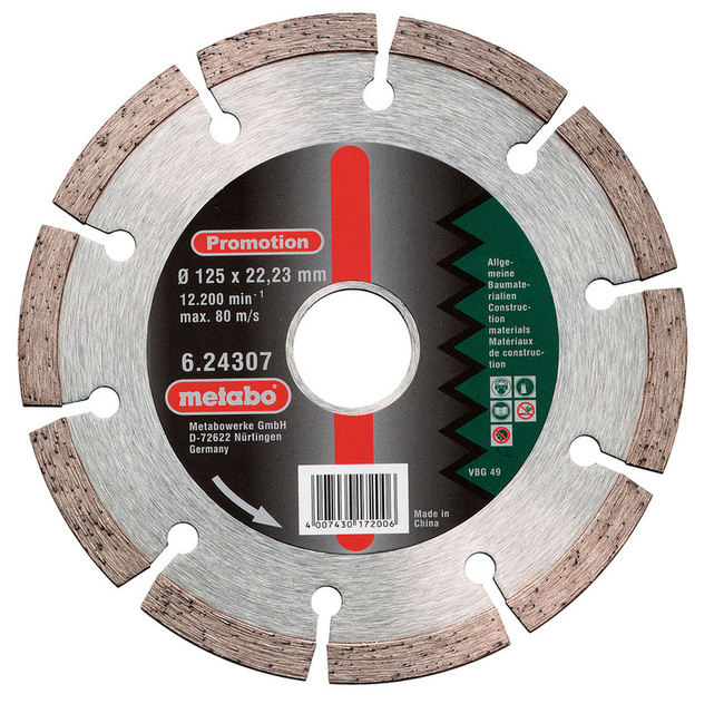Алмазный диск "Metabo" подходит для всех общих строительных материалов, таких как: бетон, мокрый бетон, твердый песчаник, необожженный кирпич. Круг имеет спеченные алмазные сегменты.