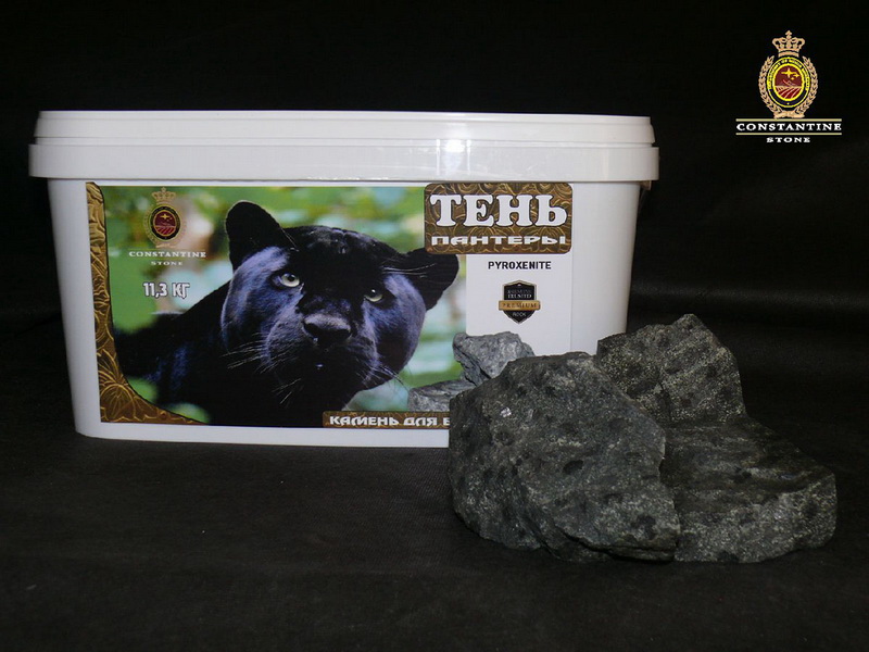 Камень для бани «ТЕНЬ ПАНТЕРЫ Пироксенит» (принадлежит «Камень Константина»™) — это камень-наполнитель, представляющий собой произведенную по оригинальной технологии, обработанную, фракционированную и особым образом смешанную продукцию из натуральных горных пород для печей открытого горения, электропечей, газовых печей, парогенераторов. Используется в банях, саунах, турецких банях (хамам).