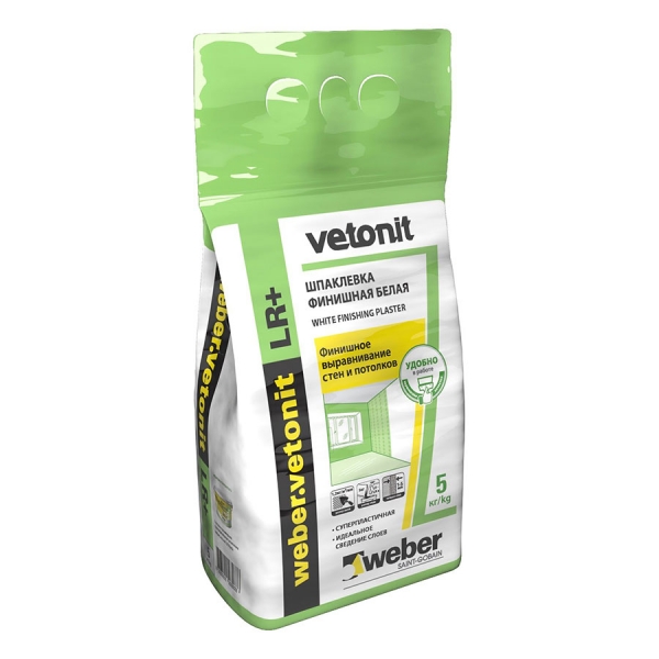 Финишная шпаклевка weber.vetonit LR+ изготавливается из тонкомолотого мрамора в качестве наполнителя и полимерного клея (связующее). Служит для финишной обработки поверхностей в сухих помещениях перед поклейкой обоев или ее окраской. Наносить смесь следует на уже выровненную поверхность. Время жизнеспособности раствора – 24 часа (48 часов в закрытой таре). Полное высыхания слоя в 1-5 мм происходит через сутки. Остатки материала, как сухого, так и затворенного, следует утилизировать как строительный мусор – не спускать в канализацию.