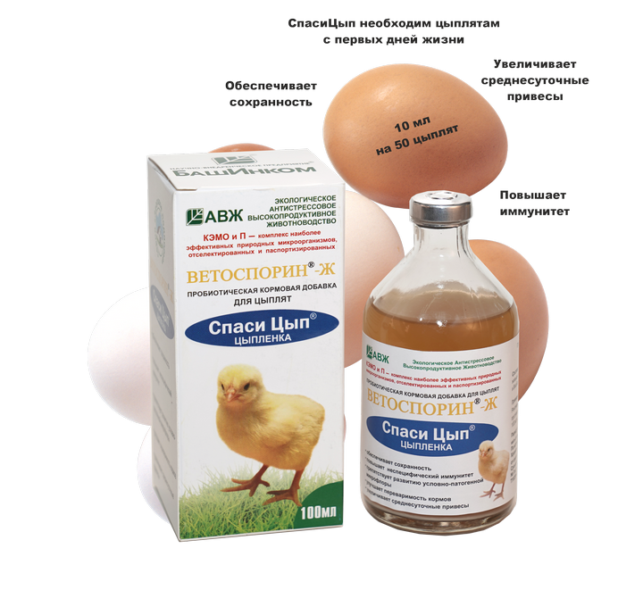 СпасиЦып необходим цыплятам с первых дней жизни. Ведь в условиях птицефабрики, инкубатора обогатить кишечник полезной микрофлорой птице просто негде. А применение дезинфектантов и противомикробных препаратов в промышленном производстве не позволяет им получать полезную микрофлору из природных источников, поэтому любое изменение условий содержания и кормления может вызвать у цыплят и взрослых птиц нарушение пищеварения, восприимчивость к респираторным заболеваниям, снижение прироста и продуктивности.