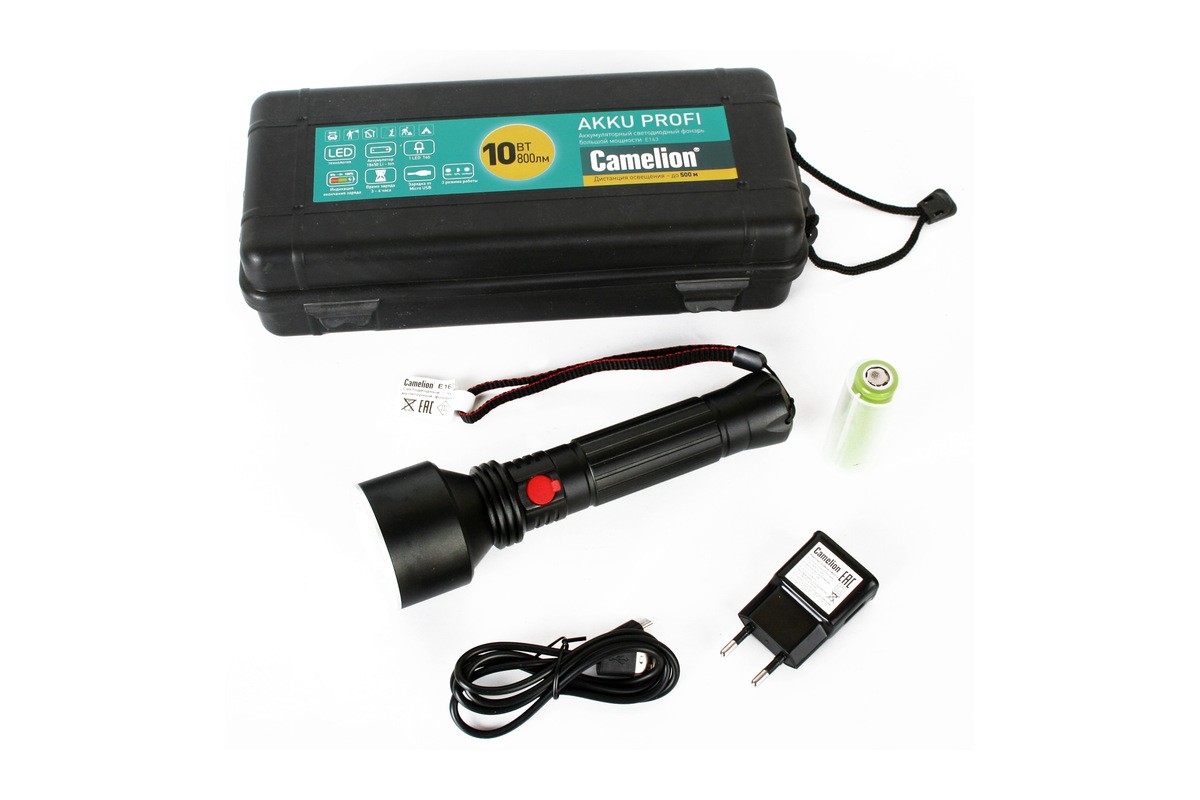 Фонарь microUSB 10Вт 3.7В 3реж. аккум. (кабель в компл.) чёрный LED E163 Camelion
