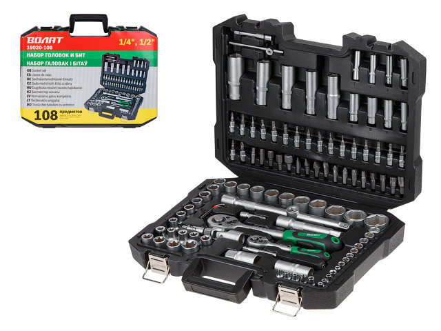Набор Торцевых головок и бит 108 предметов 1/4", 1/2", 6 граней Волат