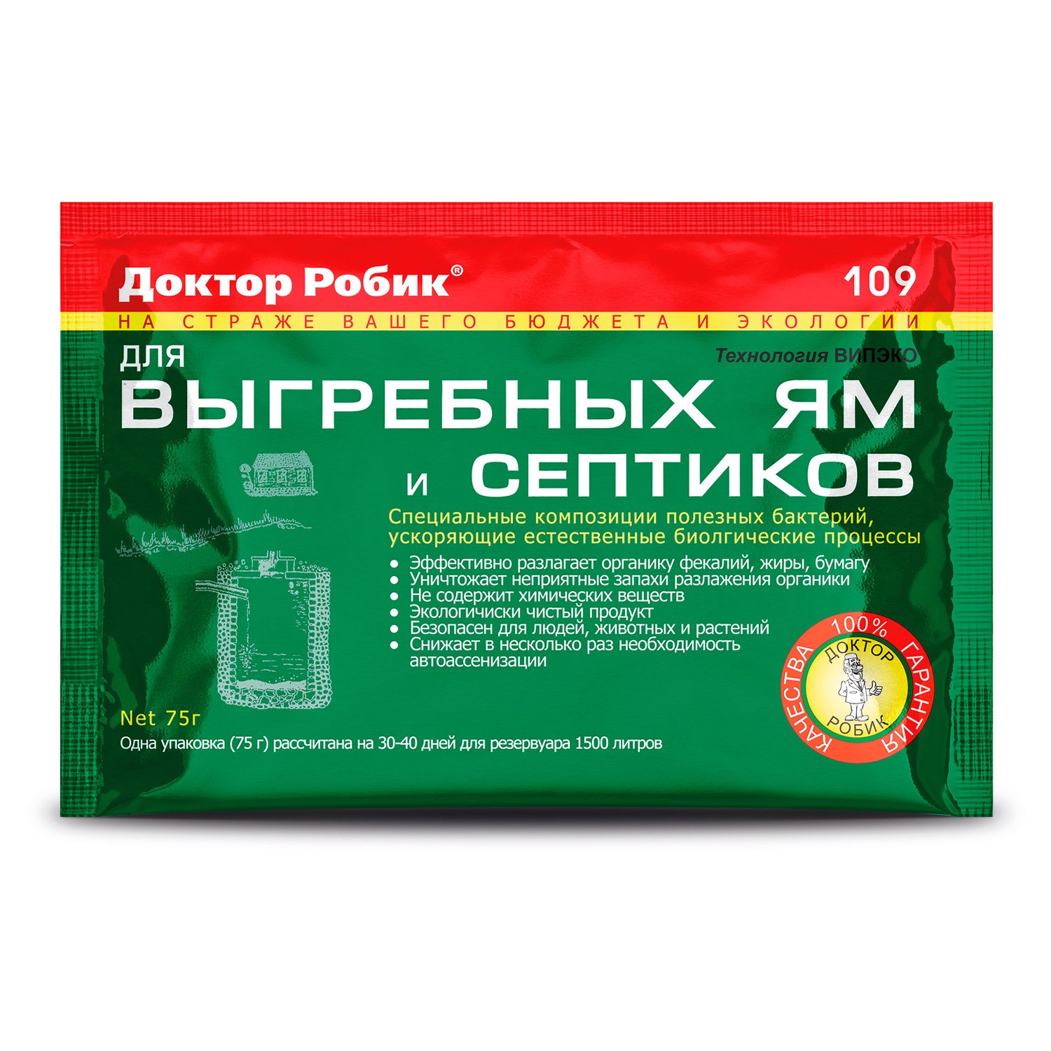 Доктор Робик 109 - экологичный катализатор природных процессов биологического распада. Композиция содержит специально подобранные микроорганизмы и культуры, которые устраняют продукты жизнедеятельности за 30-40 дней.