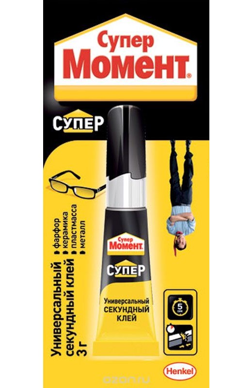 Клей Супер "Момент" имеет прозрачный состав, который делает незаметным место склеивания. Специальный колпачок обеспечивает хранение в течение двух лет. Клей производится в Ирландии и отвечает всем европейским стандартам качества. Сверхпрочный клеевой шов выдерживает нагрузку до 200 кг на см2.