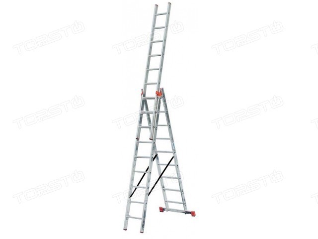 По своей конструкции алюминиевая трехсекционная лестница 3х15 схожа на обыкновенную лестницу-стремянку, но без площадки и имеет третью выдвигающуюся секцию консольного вида. Таким образом, лестница из 3-х секций обеспечивает устойчивость изделия, позволяя при этом залезть на большую высоту. Так же такую модель можно применять как приставную лестницу.